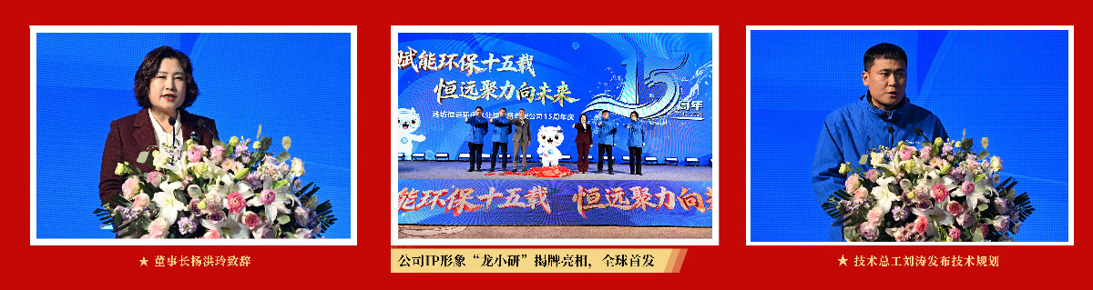 傍晚,周年慶典晚宴溫情啟幕,各級領(lǐng)導(dǎo)、行業(yè)專家、合作伙伴、客戶朋友及全體恒遠(yuǎn)人齊聚一堂,共同見證這一重要時刻。楊洪玲董事長發(fā)表致辭,回顧15年發(fā)展歷程,分享恒遠(yuǎn)環(huán)保的初心與未來規(guī)劃,字里行間滿是堅守與期許,其規(guī)劃部署為公司未來發(fā)展指明了方向,贏得現(xiàn)場熱烈掌聲。隨后,現(xiàn)場舉行恒遠(yuǎn)環(huán)保IP形象“龍小研”揭牌儀式,鮮活生動的IP形象傳遞出公司綠色發(fā)展的理念。緊接著,技術(shù)總工劉濤上臺發(fā)布技術(shù)戰(zhàn)略,詳細(xì)闡述了公司在技術(shù)研發(fā)、產(chǎn)品迭代升級等方面的核心方向與實施路徑,彰顯了恒遠(yuǎn)環(huán)保以技術(shù)創(chuàng)新驅(qū)動高質(zhì)量發(fā)展的決心。